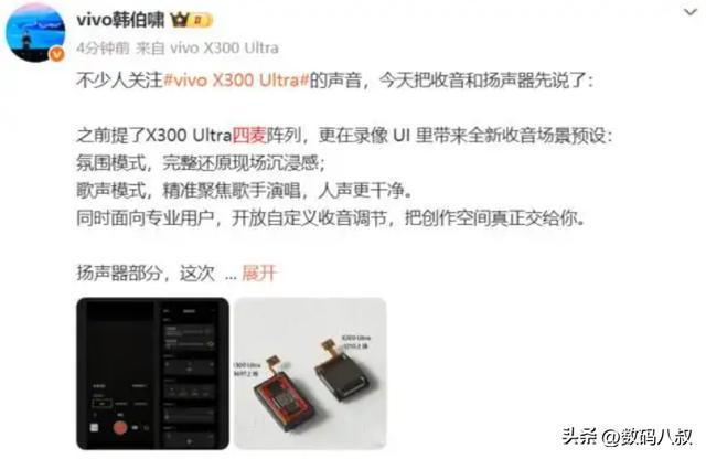 影像系统是vivo X300 Ultra的核心亮点,实现全蔡司认证、全超大底与全黄金焦段覆盖,主摄为2亿像素1/1.12英寸索尼LYTIA-901传感器,支持CIPA 6.5级防抖;超广角为14mm蓝图索尼LYTIA-818传感器,防抖等级提升至CIPA 6.0;长焦为2亿像素三星HP0传感器,支持CIPA 7.0专业级防抖,并可搭配200mm与400mm超长增距镜,满足极限远摄需求。