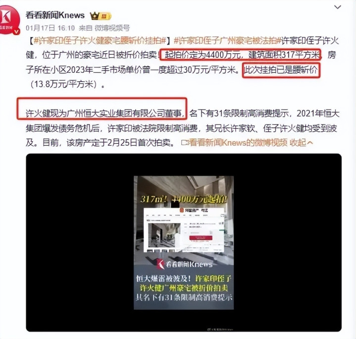 许家印的侄子许火健,也未能置身事外。2026年1月,许火健名下的豪宅被依法拍卖。