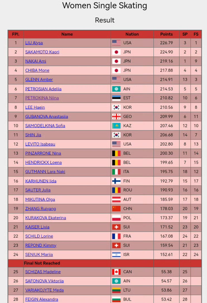 美国华裔选手刘美贤226.79分,爆冷夺得金牌。17岁的中井亚美获得铜牌,另一名日本选手千叶百音获得第四名。