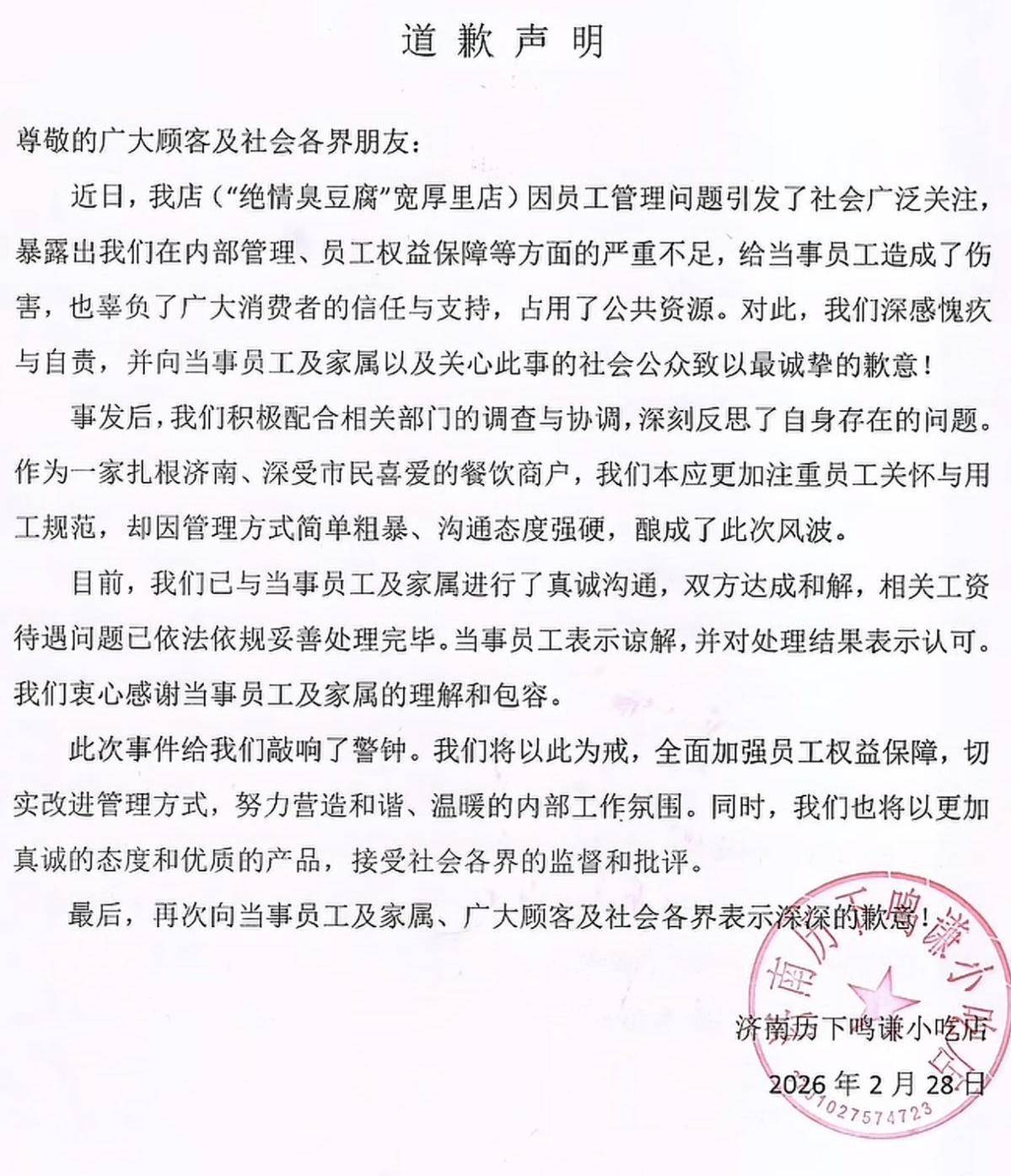 2月28日,济南市历下区人力资源和社会保障局维权服务一部负责人接受采访称,该单位约谈涉事商家,向员工家属核实,就工资发放、加班费核算、辞退手续等问题进行调查,双方签署协议达成和解。当日,涉事商家通过社媒账号发布道歉声明,向当事员工及家属、关心此事的社会公众道歉,相关的工资待遇问题已得到妥善处理。声明称,因管理方式简单粗暴、沟通态度强硬,造成了本次风波。李女士则通过社媒账号发布声明称,父亲与涉事店面解除劳动关系,向北京韩红爱心慈善基金会捐赠部分赔款29061.5元。