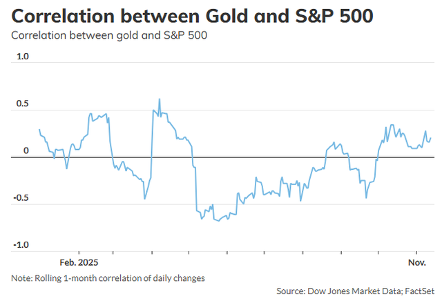 道琼斯市场数据对FactSet数据的分析显示,截至上周五,COMEX最活跃的黄金期货与标普500指数的21天滚动相关系数为0.22,略呈正相关。在今年10月和11月至今,该相关系数大多数时段内维持着温和的正相关状态。