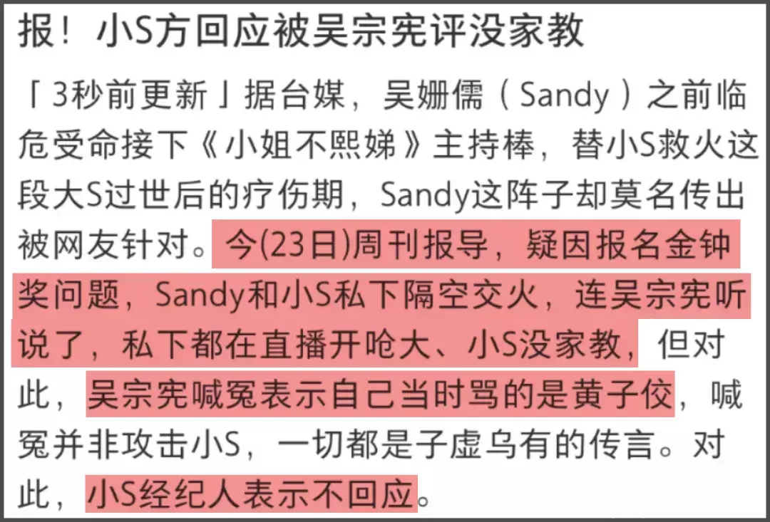 似乎自从吴姗儒代班开始,不是传出节目投资商撤资的消息,就是传出吴宗宪骂小S没家教,虽然吴宗宪否认此事,但吴姗儒和小S之间的关系似乎越来越微妙了。