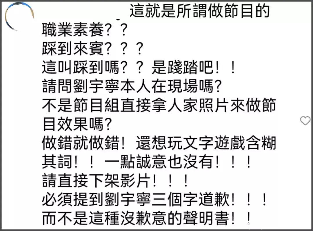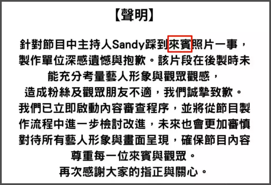 事情发酵之后,节目组发表声明道歉,但却把刘宇宁定义为“来宾”,声明全文都没有提及刘宇宁的名字,用词也避重就轻,网友对此并不买账,纷纷喊话要求换掉主持人,甚至还有网友直接喊话小S回归。