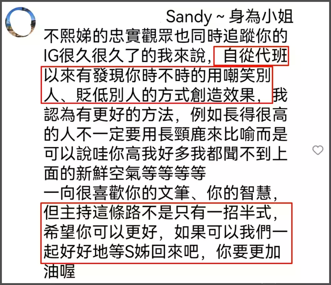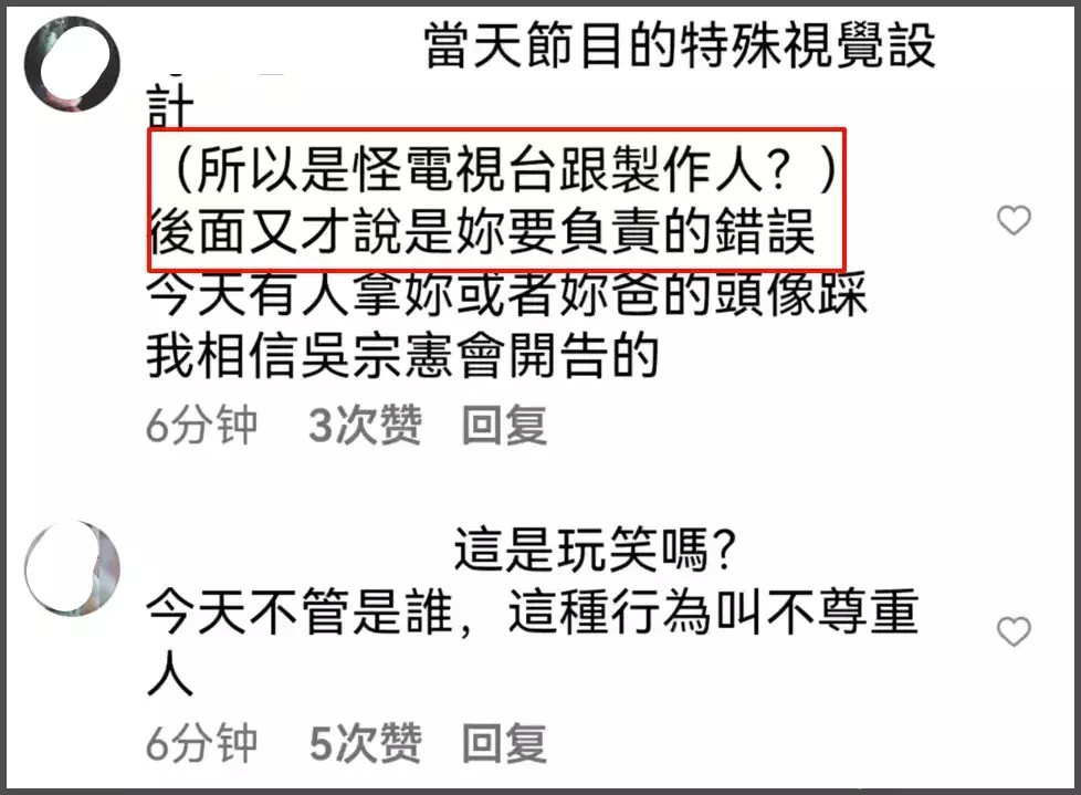 还有观众开始质疑她的主持能力,发现她总是以嘲笑、贬低别人的方式来制造节目效果,只会这一招半式,甚至表示“一起等S姐回来吧”,还有观众埋怨吴姗儒只是来代班,却毁了小S的节目,就差明说要吴姗儒主动辞职了。