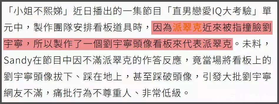 有网友表示疑惑,按理说,刘宇宁和《小姐不熙娣》是完全无关联,但为什么他的照片会出现在节目上呢?据台媒爆料称是因为另一位男主持派翠克“撞脸”刘宇宁,所以就用刘宇宁的照片来代表派翠克。