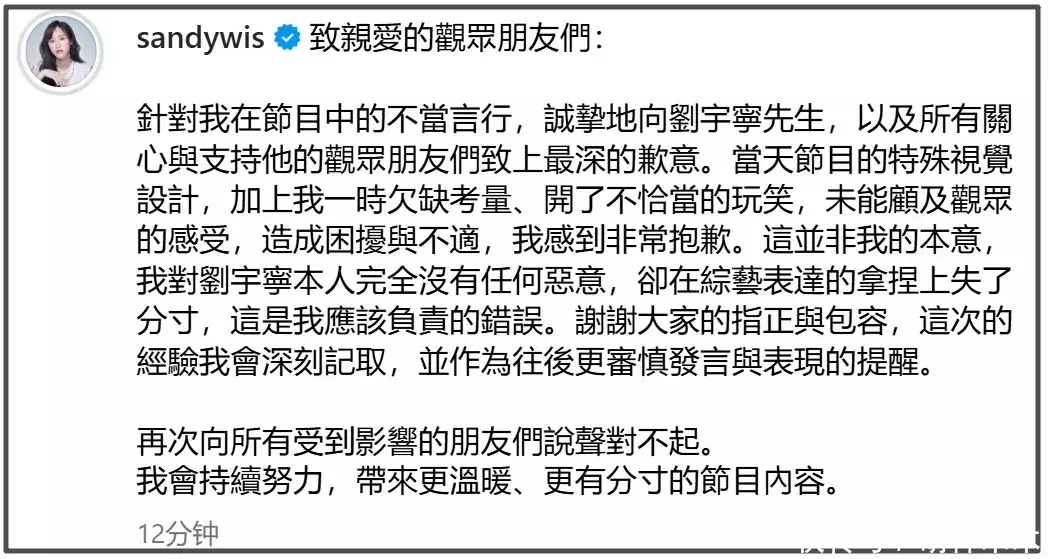 随后吴姗儒也发文向刘宇宁和观众道歉,文中提到用刘宇宁照片代表派翠克疑似是“节目的特殊视觉设计”,表示自己做出踩照片的举动是一时欠缺考量、开了不恰当的“玩笑”。